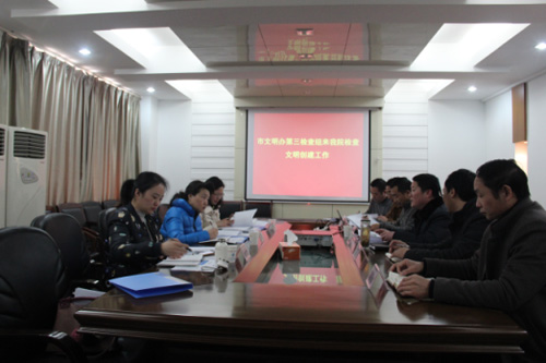 2月13日下午,市文明辦檢查組第三小組在領(lǐng)隊(duì)、市文明辦辦公室主任王曉群帶領(lǐng)下,對(duì)我院申報(bào)創(chuàng)建第十一屆市文明單位進(jìn)行檢查驗(yàn)收。檢查組首先聽取了賀玉龍?jiān)洪L代表我院所作的創(chuàng)建工作匯報(bào),隨后按照《第十一屆滁州市文明單位測評(píng)細(xì)則》對(duì)我院申報(bào)創(chuàng)建材料進(jìn)行了認(rèn)真的查驗(yàn),并對(duì)我院辦公及周圍環(huán)境進(jìn)行了實(shí)地查看。副院長丁文軍、王士才、黃明華、袁家金和院文明創(chuàng)建領(lǐng)導(dǎo)小組辦公室主任季阿祥參加了匯報(bào)會(huì)。