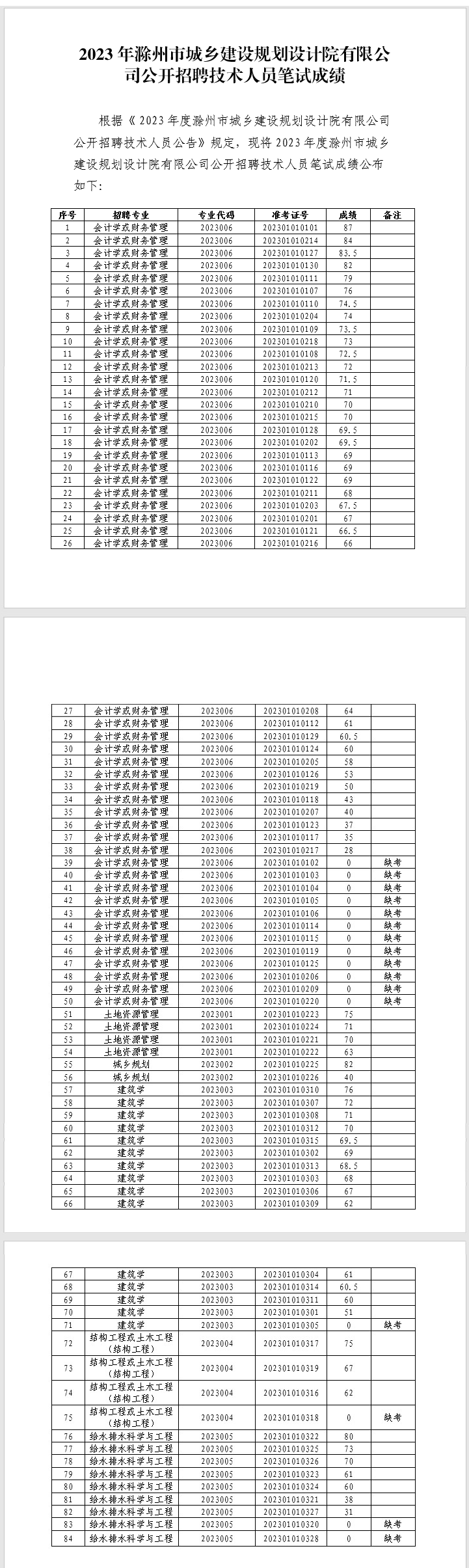 2023年滁州市城鄉(xiāng)建設(shè)規(guī)劃設(shè)計(jì)院有限公司公開(kāi)招聘技術(shù)人員筆試成績(jī)