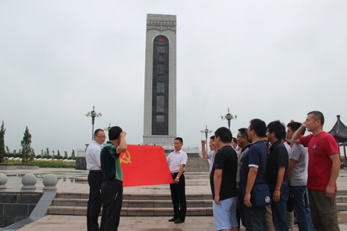 在紀(jì)念碑下,全體黨員面對鮮紅黨旗舉起右手高聲宣誓,重溫入黨誓詞,表達(dá)為黨的事業(yè)奮斗終身的決心。隨后,全體人員在革命烈士紀(jì)念碑前,全體肅立,向革命先烈默哀致敬,行三鞠躬禮,追思革命先烈的豐功偉績;顒幼詈髤⒂^了革命烈士紀(jì)念館,進(jìn)一步了解革命先烈們艱苦卓越的斗爭歷史和大無畏的革命獻(xiàn)身精神。